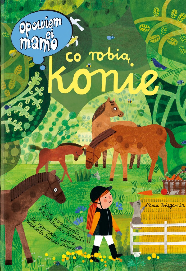 Opowiem ci, mamo, co robią konie to wyjątkowa pozycja dla wszystkich małych miłośniczek i miłośników tych pięknych zwierząt. Spotkacie tu konie, kucyki, koniki polskie, rzadkie zebryny oraz zebrule, a także te zupełnie wymyślone: jednorożce czy centaury. Dowiecie się, czym się różni cwał od kłusu i galopu oraz co zapleść z końskiej grzywy. Poznacie mnóstwo końskich maści: w tym szampańską, myszatą i tarantowatą. Zajrzycie też do stajni, by odkryć, w co się ubiera jeździec, jak jest skonstruowane siodło oraz co konie jedzą i jak spędzają wolny czas.